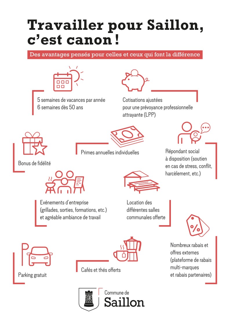 La commune de Saillon s'engage à offrir des conditions d'emploi modernes et des prestations sociales de qualité. Une équipe de plus de 80 employés travaillent au service de la population. Notre culture d'entreprise, basée sur l'humain et la durabilité, offre des opportunités de travail variées dans un environnement dynamique.